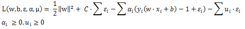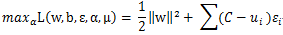 其中 C 为惩罚参数,它的目的是使得目标变量最小即几何间隔最大,且使得松弛变量最小化。加入松弛变量的目标函数就是软间隔最大化