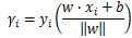 其中 xi 代表第 i 条数据,yi 代表第 i 条数据对应的目标变量的取值,取值有+1 和-1 两种。所以当第 i 条数据被正确分类时,y 取值和 w*x+b 取值的正负一致,几何间隔为正;当被错误分类时,y 取值和 w*x+b 取值的正负相反,几何间隔为负。