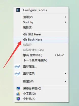 鼠标邮件菜单里就多了Git GUI Here和Git Bash Here两个按钮,一个是图形界面的Git操作,一个是命令行,我们选择Git Bash Here。