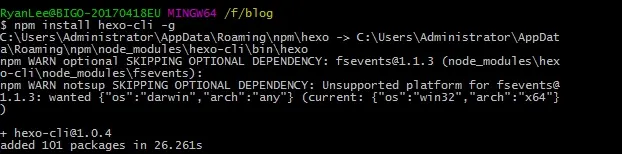 创建Hexo文件夹 安装完成后,根据自己喜好建立目录(如F:\Blog\Hexo),直接进入F:\Blog\Hexo文件夹下右键鼠标,点击Git Bash Here,进入Git命令框,执行以下操作。