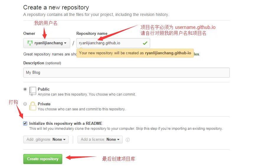 那么现在本地的博客已经搭建起来了,但是我们只可以通过本地连接查看我们的博客。那么我们现在需要做的就是把本地的博客发布到服务器上,让别人也可以连接我们的博客,而Github Pages就帮我完成了这件事情。但是Github Pages的代码就是寄存在Github上面的。那么接下来我们需要在Github上面创建一个新的项目。