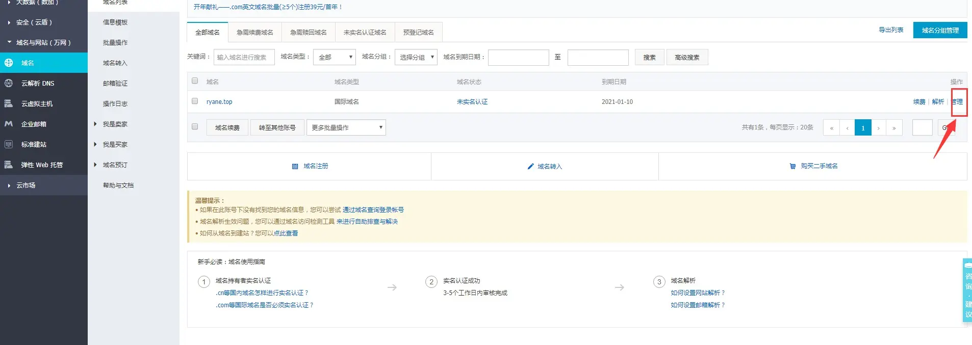 1.如果你是在阿里云购买域名的话,请登录阿里云网站。打开个人中心,点击域名