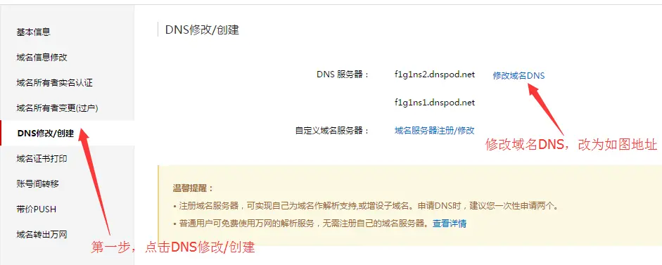 5、将IP输入过去,然后会提示你到域名注册的地方修改DNS。等待生效,最迟72小时生效。即可通过你的域名浏览你的博客主页。