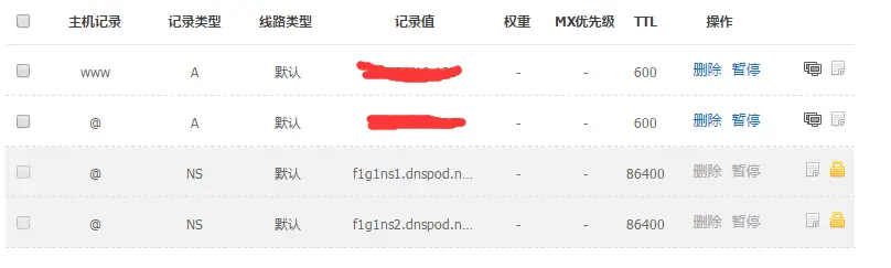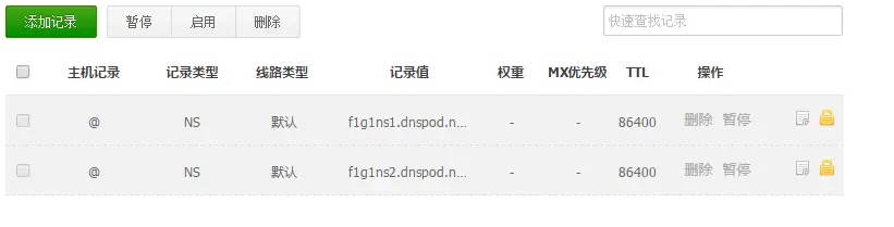 3、此时点击添加记录,添加两个记录,一个主机记录为@, 一个为www,而记录值都是填同一个,填你的博客主页对应的ip,添加完后如下。