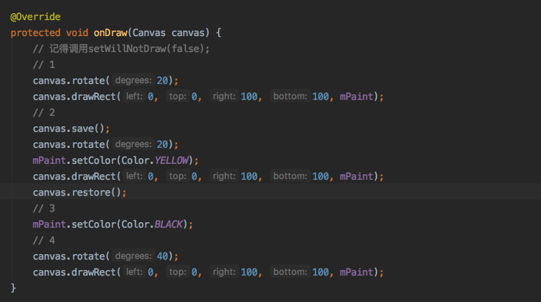 步骤1把默认坐标系旋转20°,画出第一个蓝色的方形,步骤2保存当前的matrix(旋转了20°),继续旋转20°,此时坐标系已经旋转了40°,画出第二个黄色的方块,步骤3,恢复上一步保存的matrix(旋转了20°),此时坐标系还是旋转了20°,步骤4,再旋转40°,此时坐标系旋转了60°,画出第三个黑色方块。