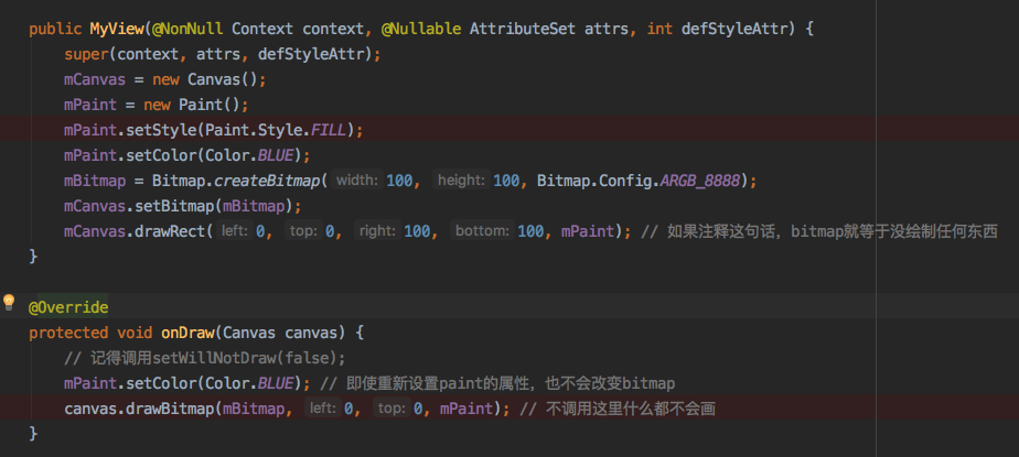 这个例子中构造了两个Canvas和一个Bitmap,分别调用其draw方法,先是mCanvas往Bitmap里绘制一个方块,再在onDraw方法内调用canvas.drawBitmap绘制这个方块。