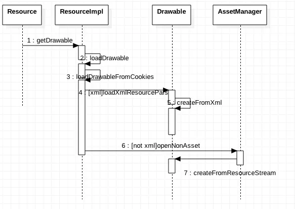 从Resource.getDrawable会判断是否.xml结尾,不是的话走6,7步,如果从xml中读取,需要getResource.getDrawable -> ResourceImpl.loadDrawableForCookie -> drawable.createFromXml -> DrawableInflater.inflateFromXmlForDensity -> drawable.inflateFromTag