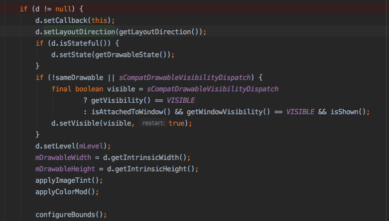 bounds在哪里设置的?答案是ImageView.updateDrawable内,会调用Drawable.getIntrinsicHeight赋值(从xml中size属性读取),再调用configureBounds -> setBounds,如果使用的不是ImageView,一定要在draw之前调用setBounds,否则size就会出错。