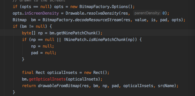 取到屏幕密度之后调用BitmapFactory.decodeResourcesStream,计算密度后调用native创建Bitmap,感兴趣的同学可以看下更具体的分析文章(如理解Bitmap)。