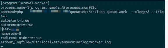 command: 这里按我的理解是指 supervisor会对这个command命令所产生的进程进行管理,但是由于我们不在项目文件夹下,不能直接php artisan queue:work,所以我们在artisan前面加上我们的项目路径,被马赛克遮住的部分就是我们laravel项目的文件目录 -