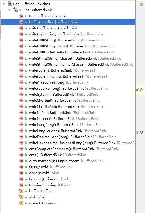 可以看出来sink就4个方法,write方法有个参数叫buffer,还有个方法叫flush,很容易才想到这个东西跟缓存是相关的。 接着看她的子类BufferedSink