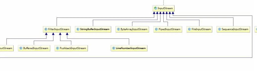 结合前面的图 我们可以得知,inputstream有很多子类,这里我们重点看一下 一个特殊的子类,FilterInputStream, 因为很容易看出来,InputStream中其他子类就到底了,没有子类的子类了,但是这个FilterInputStream 仍然有不少子类