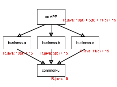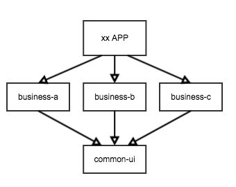 现一个 APP,它为了实践组件/模块化,拆分出了 common-ui ,business-a, business-b… 依赖关系如下图所示: