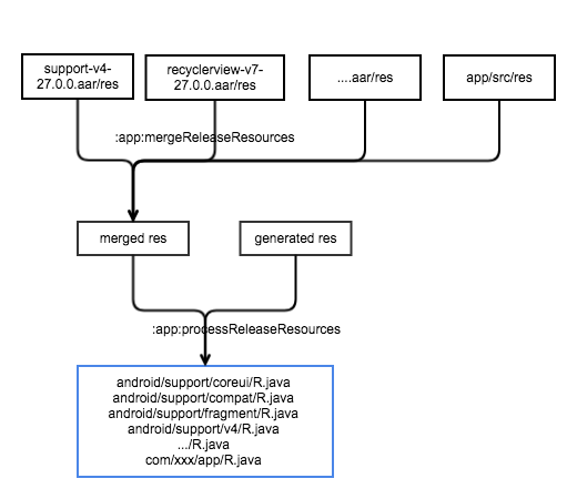 其中processReleaseResources 实际是调用的 aapt工具来给每个依赖的Library都生成一个最终确定的R.java。