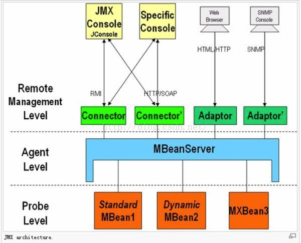 Probe Level:负责资源的检测(获取信息),包含MBeans,通常也叫做Instrumentation Level。MX管理构件(MBean)分为四种形式,分别是标准管理构件(Standard MBean)、动态管理构件(Dynamic MBean)、开放管理构件(Open Mbean)和模型管理构件(Model MBean)。
