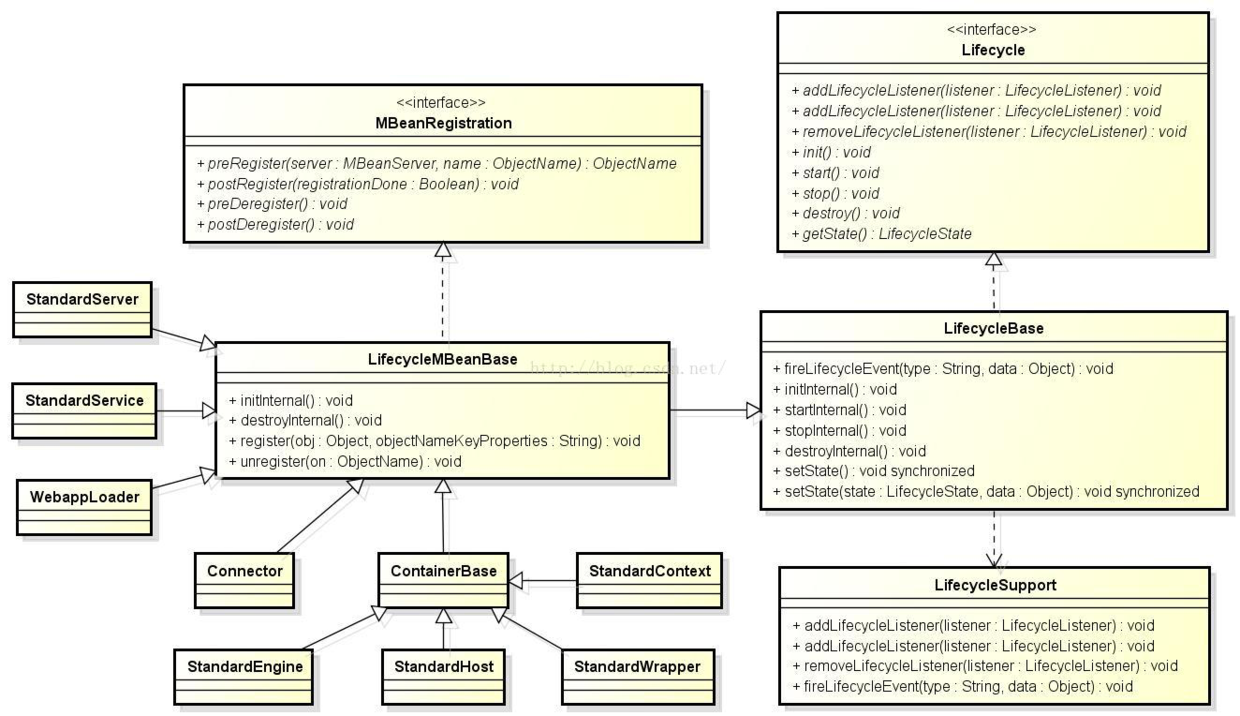 此外,ContainerBase、StandardServer、StandardService、WebappLoader、Connector、StandardContext、StandardEngine、StandardHost、StandardWrapper等容器都继承了LifecycleMBeanBase,因此这些容器都具有了同样的生命周期并可以通过JMX进行管理。