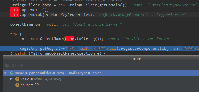 LifecycleMBeanBase.getDomainInternal 方法, 这三个方法由具体子类实现,会生成一个专属于容器的key。格式为:Catalina:type=Server, 这是 Server 容器的 key, debug 可以看出来:
