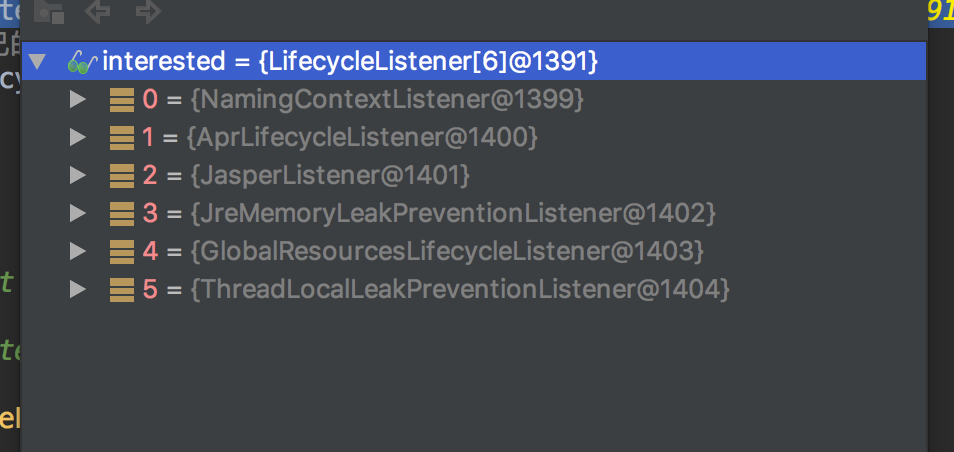 LifecycleListener interested[] = listeners;// 监听器数组 关注 事件(启动或者关闭事件)