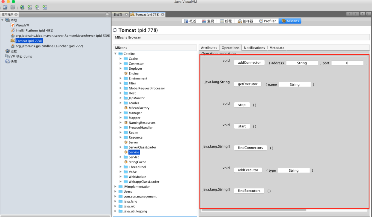 这是 JDK 自带的 JvisualVM 工具, 添加了 MBeans 插件, 就可以远程操作容器中的 组件了, 可以看到 Service 容器暴漏了很多接口, 用于运维人员管理容器和组件。