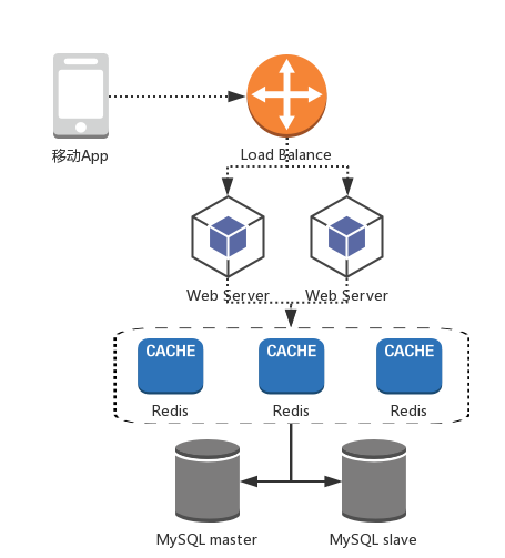 该公司是一家P2P理财网站,常有用户在整点抢购高利率理财产品的“整点秒杀活动”。如上图所示,终端用户请求先通过前端负载均衡,然后到达运行实际电商逻辑的Web Server;再下层是运行在VM上的8台Redis,负责存储与业务相关的Cache数据,如用户Profile、理财产品信息、用户账单信息等。实际落地数据存储在MySQL中,该MySQL只进行了简单的分库分表及读写分离。