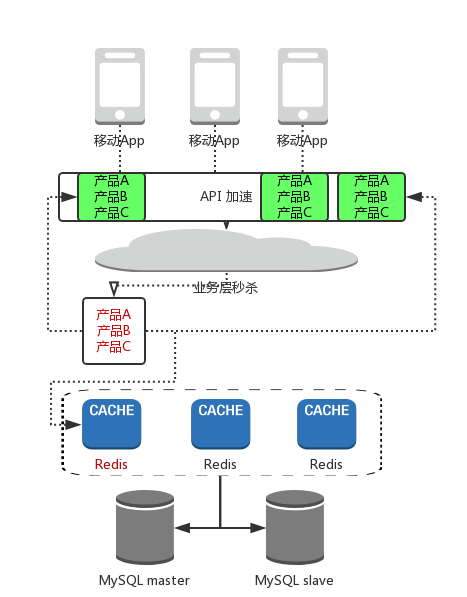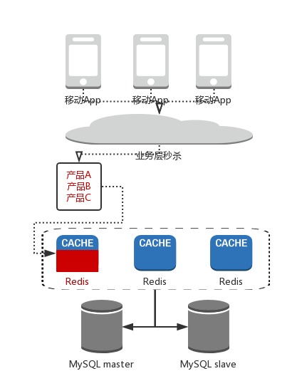该公司的业务主要来自移动端,平时流量较少,但“秒杀”活动时会瞬间产生大量流量,峰值并发达到10万以上(其中可能包括bot),如此大的并发主要是集中在以下两类接口: