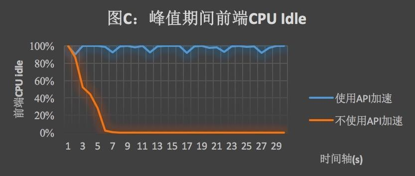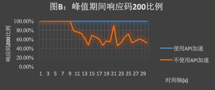 如图A所示,峰值期间终端用户请求平均响应时间,从3秒左右压缩至40毫秒以内;如图B所示,峰值期间所有请求响应码200的比例从70%左右提升至100%;图C表示,峰值期间,后端CPU Idle从10%左右提高至97%左右。实测对比数据表明,API加速对降低平均响应时间、提升用户体验效果十分显著,在降低后端服务器负载方面效果更加明显,使用API加速的后端CPU Idle可保持在91%以上。