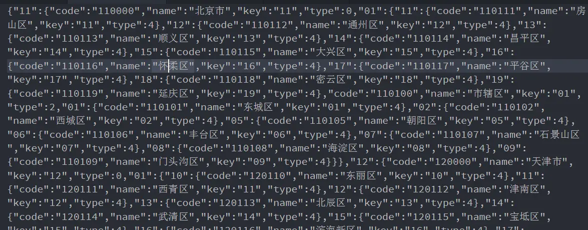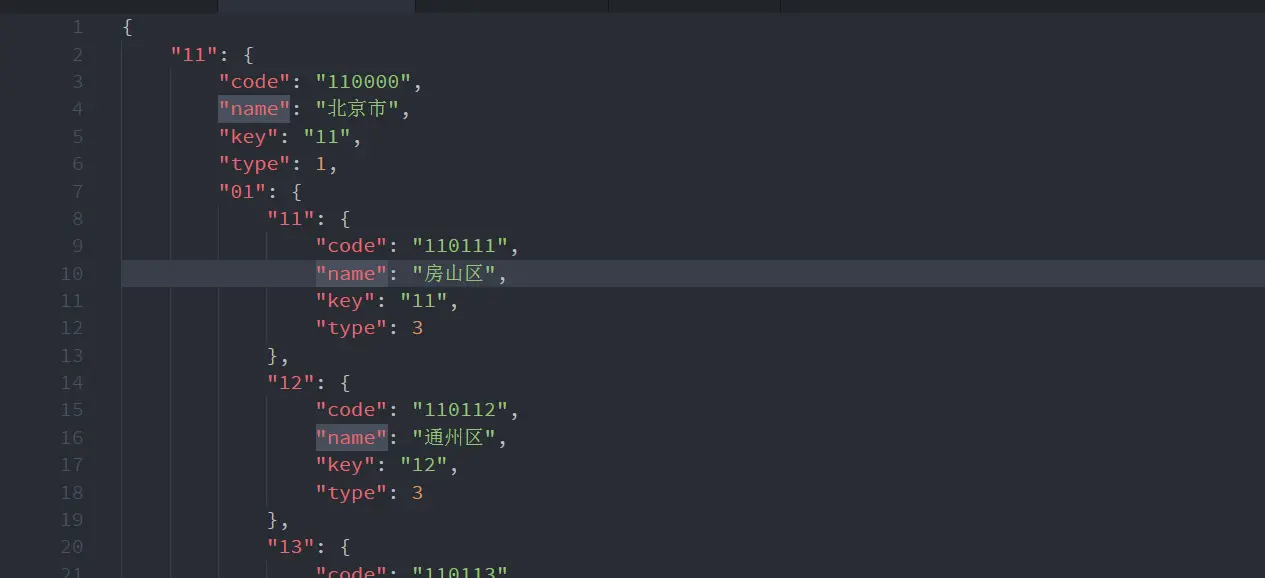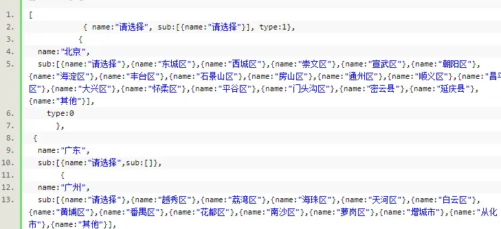 来源有了,我们现在要确定的就是数据结构。 网上很多类似的省市区数据,比如这样的: