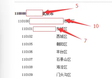 接下来我们需要处理页面数据我们靠什么来区分这条数据是省数据还是市数据还是区县数据呢?答案是城市编码和城市名称之间的空格字符的长度