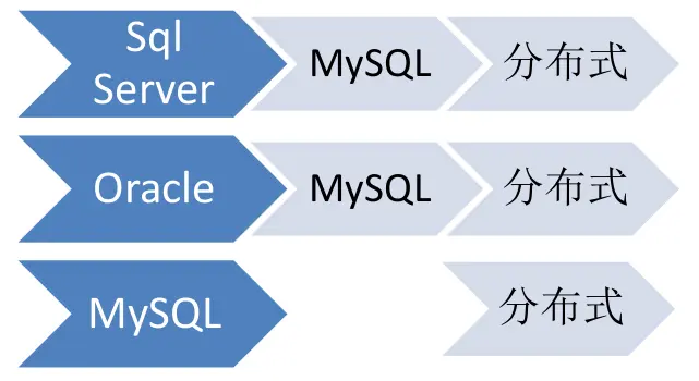 关于数据库的使用,在京东有几个趋势,早期在京东主要用SqlServer及Oracle也有少量采用MySQL,随着业务发展技术积累及使用成本等因素,很多业务都开始使用MySQL,包括早期使用SqlServer及Oracle的很多核心业务也都渐渐的开始迁移到MySQL,单机的MySQL往往无法支撑这类业务,需要考分布式的解决方案,另外原本使用MySQL的业务随着数据量及访问量的增加也会遇到瓶颈最终也会考虑采用分布式解决的方案,整个京东发展趋势如图1所示。