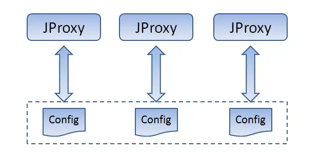 这种方案在业务库表比较少的时候是可行的,随着业务的发展库表的数量可能会不断增加,尤其是针对去Oracle的业务在切换数据库的时候可能是一次切换几张表,下一次再切换另外几张表,这就要求经常修改配置文件。另外JProxy在部署的时候至少需要部署两份甚至多份,如图5所示,此时面临一个问题是如何保证所有的配置文件在不断修改的过程中是完全一致的。在早期运维过程中,我们靠人工修改完一份配置文件,再将相应的配置文件拷贝给其他的JProxy,确保JProxy配置文件内容一致,这个过程心智负担较重且容易出错。