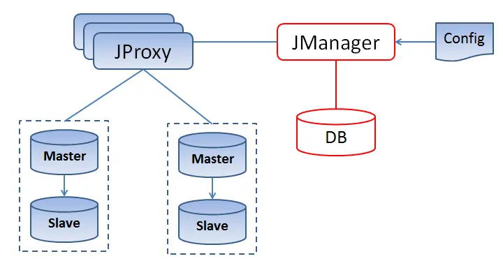 在之后的版本中我们引入了JManager模块,这个模块负责的工作是管理配置文件中的路由元信息,如图6所示。JProxy的路由元信息都是通过JManager来统一获取,我们只需要通过JManager往元数据库里添加修改路由元数据,操作完成以后通知各个JProxy动态加载路由信息就可以保证每个JProxy的路由信息是完全一致的,从而解决维护路由元信息一致性的痛点。