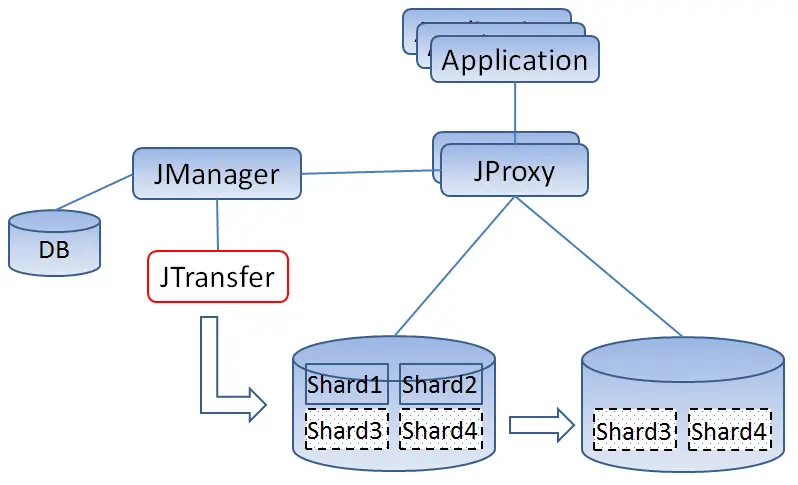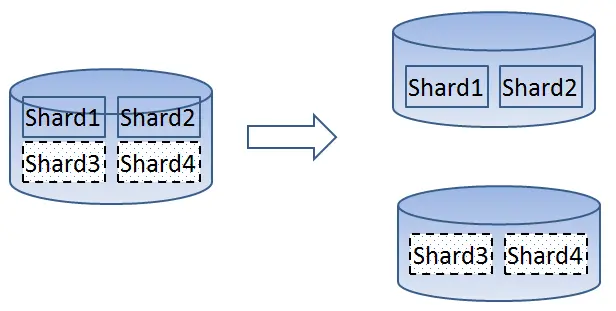 在提到分布式数据库解决方案时一定会考虑的一个问题是扩容问题,扩容有两种方式,一种我们称之为re-sharding方案,简单的说就是一片拆两片,两片拆为四片,如图7所示,原本只有一个MySQL实例一个shard,之后拆分成shard1和shard2两个分片,之后再添加新的MySQL实例,将shard1拆分成shard11和shard12两个分片,将shard2拆分成shard21和shard22两个分片放到另外新加的MySQL实例上,这种扩容方式是最理想的,但具体实现的时候会略微麻烦一点,我们短期之内选择了另一种偏保守一点在合理预估前提下足以支撑业务发展的扩容模式,我们称之为pre-sharding方案,这种方案是预先拆分在一定时期内足够用的分片数,在前期数据量较少时这些分片可以放在一个或少量的几个MySQL实例上,等后期数据量增大以后可以往集群中加新的MySQL实例,将原本的分片迁移到新添加的MySQL实例上,如图8所示,我们在一开始就拆分成了shard1、shard2、shard3、shard4四个分片,这四个分片最初是在一个MySQL实例上,数据量增大以后我们可以添加新的MySQL实例,将shard3和shard4迁移新的MySQL实例上,整个集群分片数没有发生变化但是容量已经变成了原来的两倍。