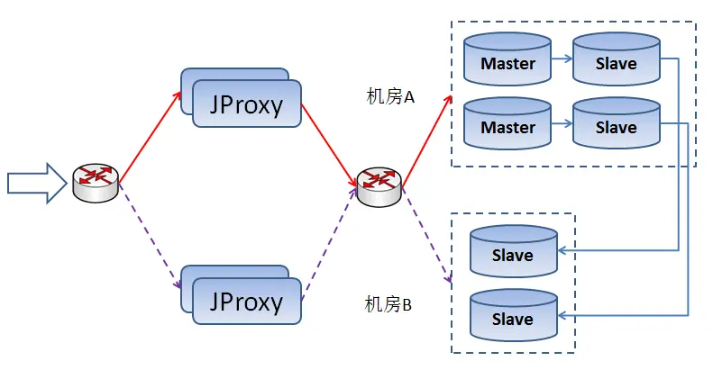除了基本的稳定性之外,在整个系统全局上还需要考虑到服务高可用方案。JProxy是无状态的,一个业务在同一个机房内部署至少两个JProxy且必须跨机架的,保证在同一个机房里JProxy是高可用的。在另外的机房会部署再部署两个JProxy,做到跨机房的高可用。除了中间件自身的高可用以外还需要保证数据库层面的高可用,全链路的高可用才是真正的高可用。数据库层面在同一个机房里会按照一主一从部署,在备用机房会再部署一个备,如图10所示。JProxy访问MySQL时通过域名访问,如果MySQL的主出异常数据库会进行相应的主从切换操作,JProxy可以访问到切换以后新的主,如果整个机房的数据库异常可以直接将数据的域名切换到备用机房,保证JProxy可以访问到备用机房的数据库。业务访问JProxy时也是通过域名访问,如果一个机房的JProxy都出现了异常,和数据库类似直接将JProxy前端的域名切换到备用机房,从而保证业务始终都能正常访问JProxy。