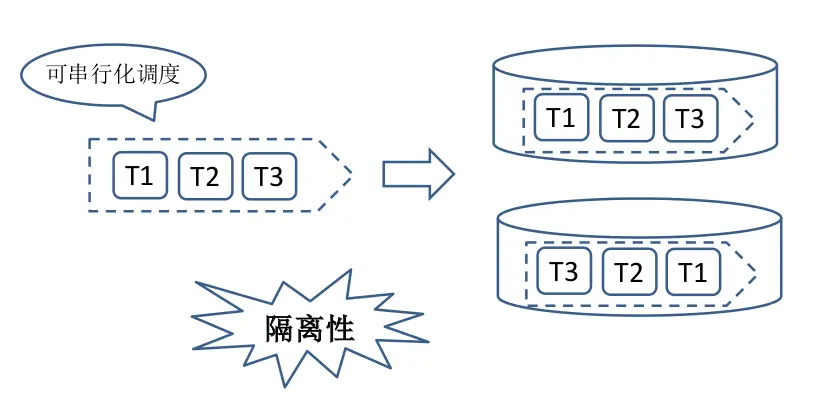 事务在数据库系统中执行的时候有一个可串行化调度的问题,假设有T1、T2、T3三个事务,那么这三个事务的执行的效果应该和三个事务串行执行效果一样,也就是最终效果效果应该是{T1/T2/T3, T1/T3/T2, T2/T1/T3, T2/T3/T1, T3/T1/T2, T3/T2/T1}集合中的一个,当涉及到分布式事务时,每个子事务之间的调度要和全局的分布式事务的调度顺序一致才能满足可串行化调度的要求,如图13所示,T1/T2/T3的三个分布式事务,在一个库中的调度顺序是T1/T2/T3和全局的调度顺序一致,在另一个库中的调度顺序变成了T3/T2/T1,此时站在全局的角度来看就打破了可串行化调度,可串行化调度保证了隔离性的实现,当可串行化调度被打破时自然隔离性也就随之打破,在基于MySQL的分布式中间件方案实现上,因为同一个分布式事务的各个子事务的事务ID是在各个MySQL上生成的,并没有提供全局的事务ID来保证各个子事务的调度顺序和全局的分布式事务一致,导致隔离性是无法保证的,所以说当前基于MySQL的分布式事务是无法保证严格的分布式事务语义支持的。当然随着MySQL引入GR可以做到CAP理论中的强一致,再加强中间件的相关功能及定制MySQL相关功能也是有可能做到支持严格的分布式事务的。