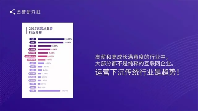 “互联网+”、“新零售”、“人工智能”进一步加快了互联网对各个行业的渗透,运营从业者数量增多,门槛也会越来越高,不同业务形态对技能的诉求也会变的具体。