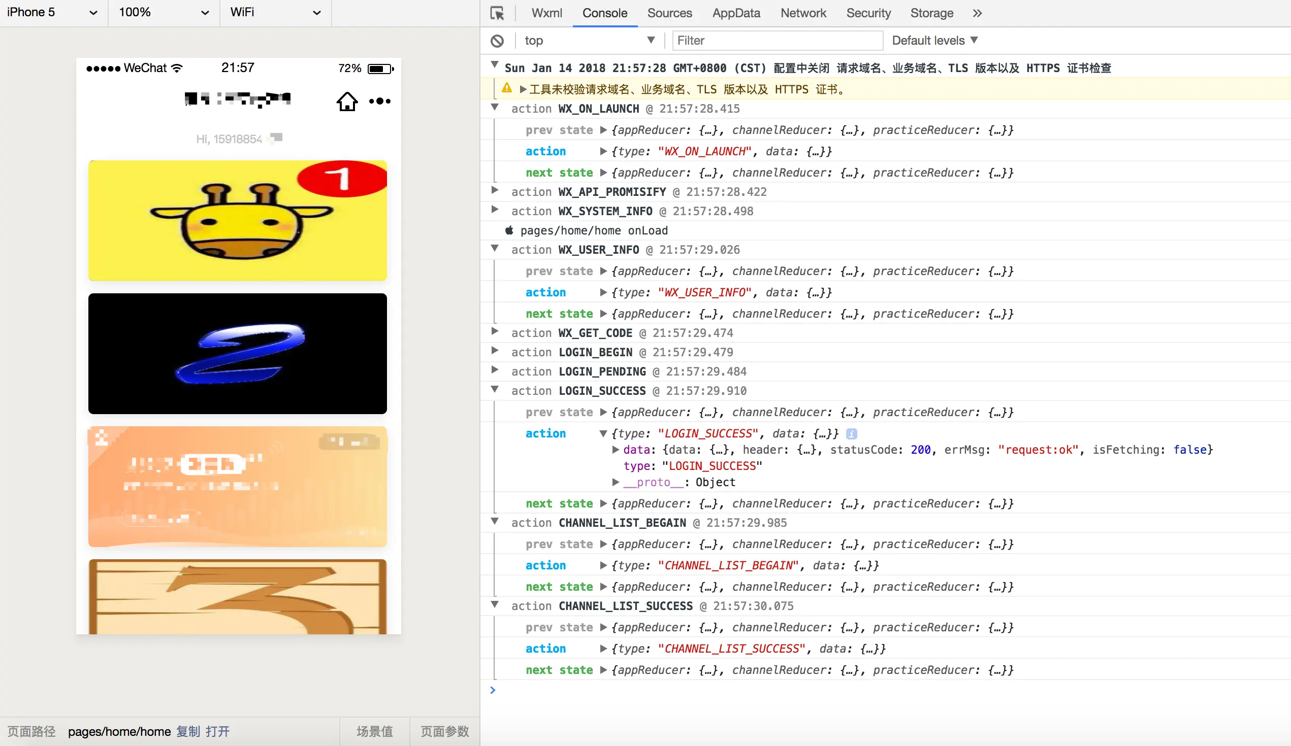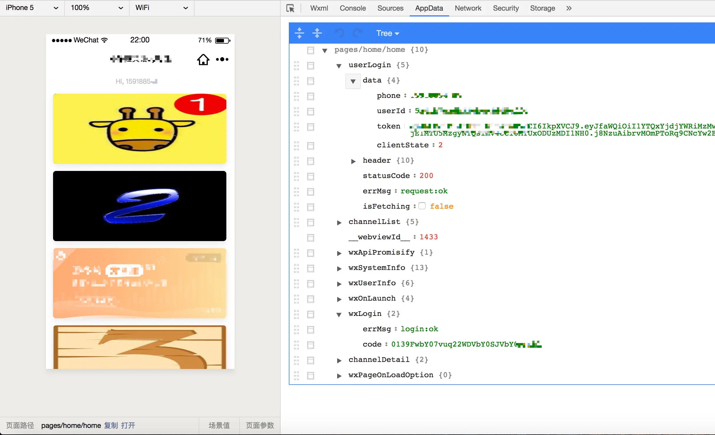 微信开发者工具 AppData pages/home/home 数据截图