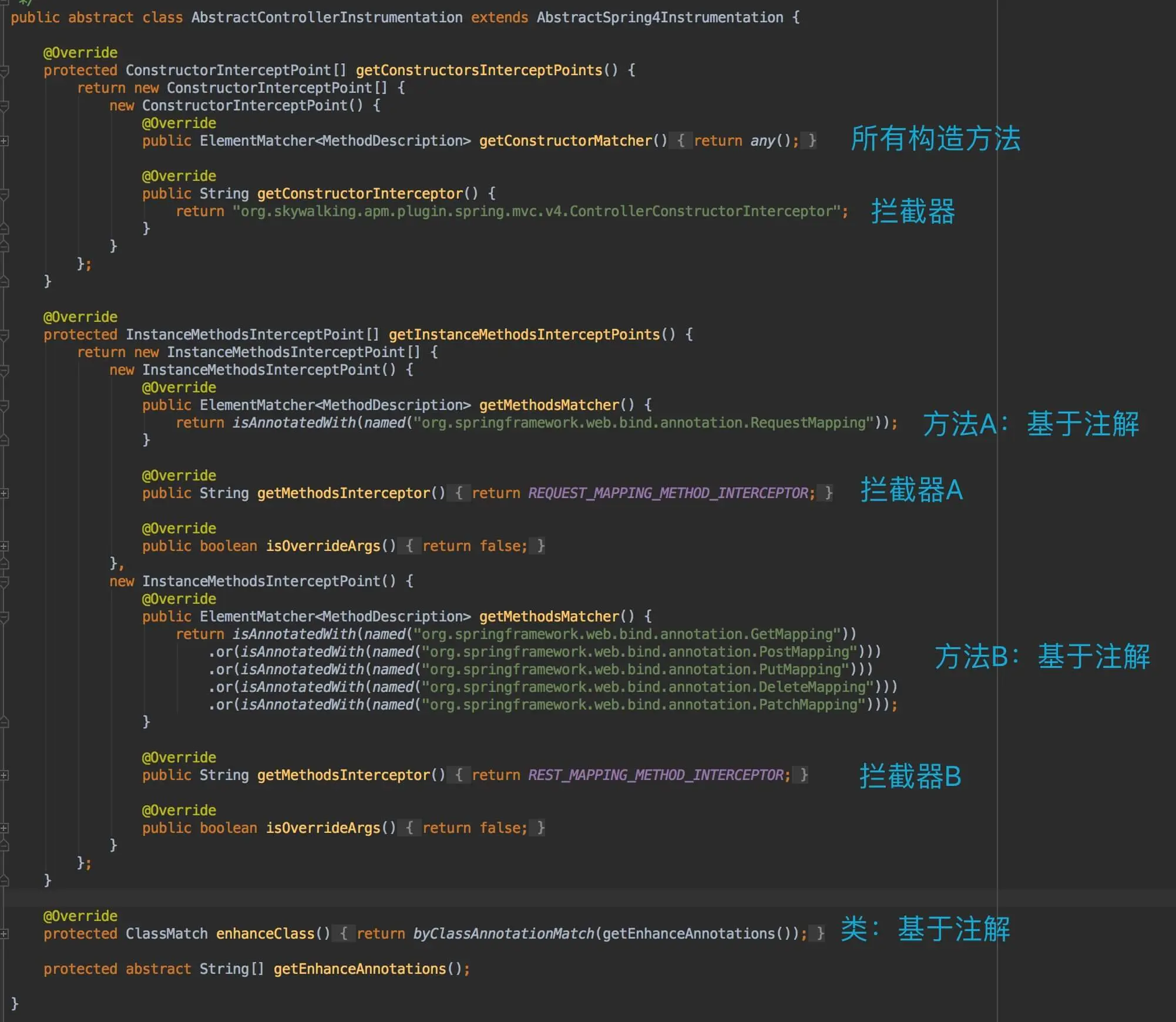 org.skywalking.apm.plugin.spring.mvc.v4.define.AbstractControllerInstrumentation ,实现 AbstractSpring4Instrumentation 抽象类,定义了方法切面,代码如下: