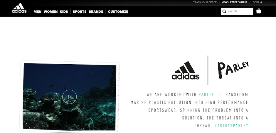 看看阿迪达斯的网站。通过与 Parley 的合作,将回收的海洋垃圾制造成高性能的运动服装,品牌希望通过销售一种关注环境未来的生活方式,引起很多观众的共鸣。这次营销重点强调了简单,网站采用了简洁的设计,添加了增加视觉吸引力的视频内容,教育用户爱护环境。