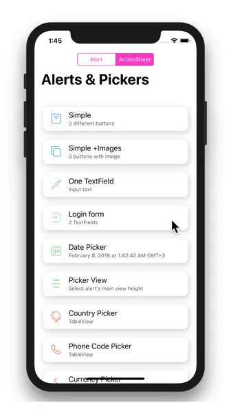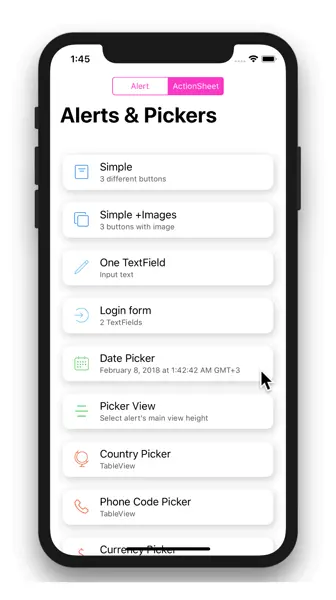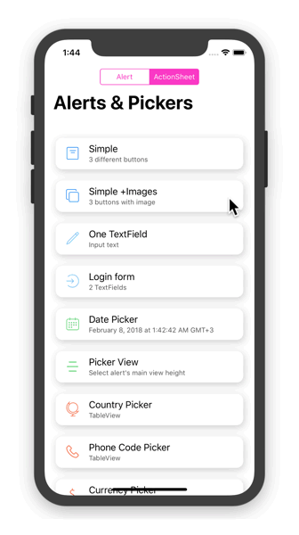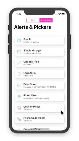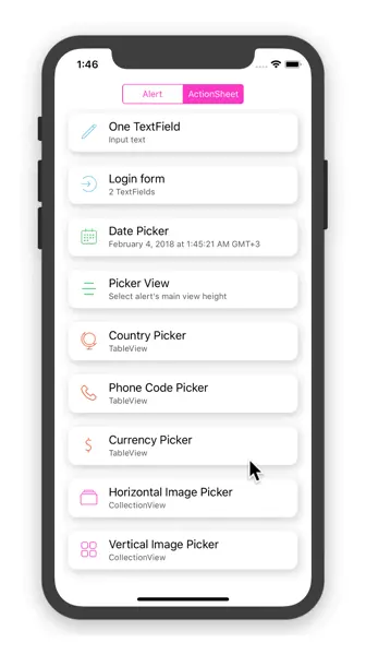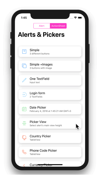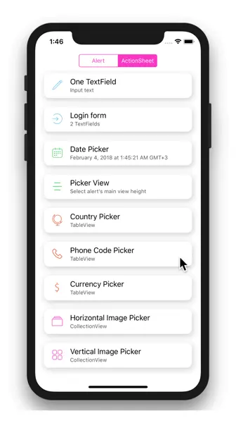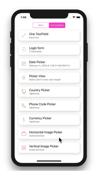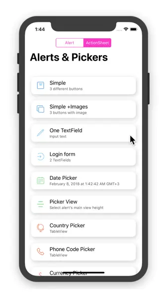 - Custom pickers based on UITextField, UIDatePicker, UIPickerView, UITableView and UICollectionView.