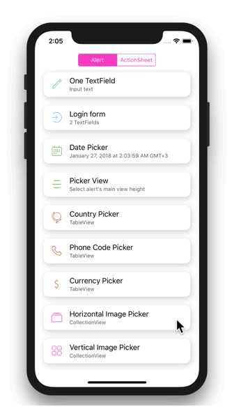 Advanced usage of native UIAlertController with TextField, DatePicker, PickerView, TableView and CollectionView.