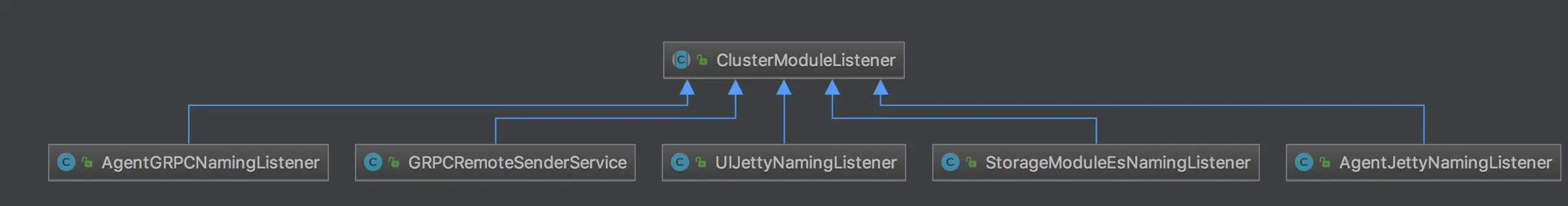 org.skywalking.apm.collector.cluster.ClusterModuleListener ,集群组件监听器抽象类。目前子类如下 :