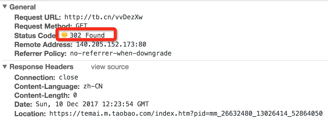我们上面天猫的一个短网址 tb.cn/vvDezXw 其是通过 302 的方式,即临时重定向的方式进行跳转的。目的就是为来能够在跳转前做一些短网址打开的次数统计,这些统计数据能够成为大数据分析的数据源,从而分析用户的生活习惯兴趣爱好。