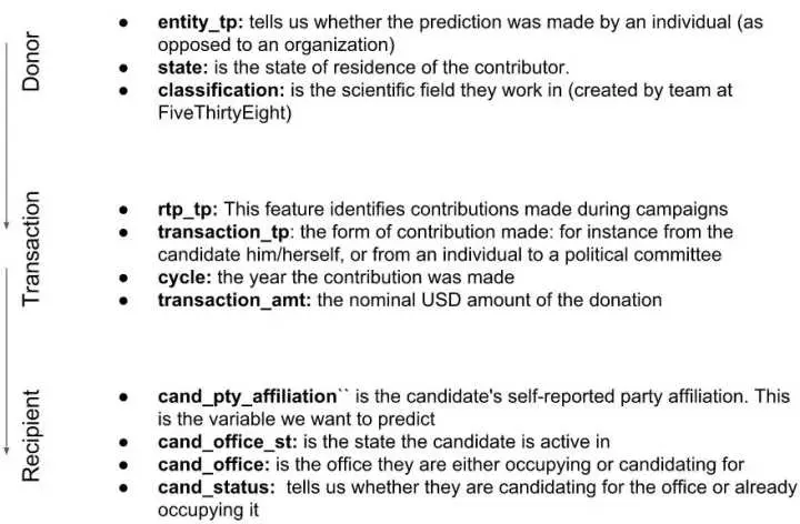 上图是 Ben 的论断的数据依据。确实,75% 的捐款是给民主党的。我们来看一下可以使用的特征,我们具备捐款人、交易详情和捐款接受者的数据信息: