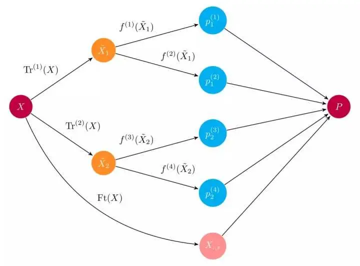 集成图示。输入数组 X 通过两个预处理 pipeline 输入至多个基学习器 f(i)。集成将所有的基学习器的预测结果结合起来,导出最终的预测数组 P。(图片来源:ml-ensemble.com/)