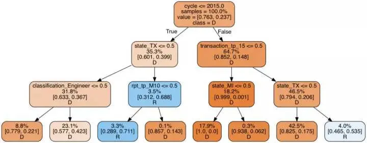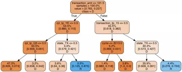 每个叶节点记录它们在训练样本中的比例、类别分布和类别标签预测。我们的决策树根据捐款金额是否超过 101.5 进行预测:它竟然作出了同样的预测!鉴于 75% 的捐款都给了民主党,这个结果并不令人惊讶。但是这没有充分利用我们已有的数据,下面我们使用三层决策规则,看看会得到什么: