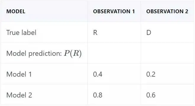 假如我们要基于两个观察结果生成预测。第一个观察结果的真正标签为共和党,第二个是民主党。在该示例中,假设模型 1 预测结果是民主党,模型 2 预测结果是共和党,如下表所示: