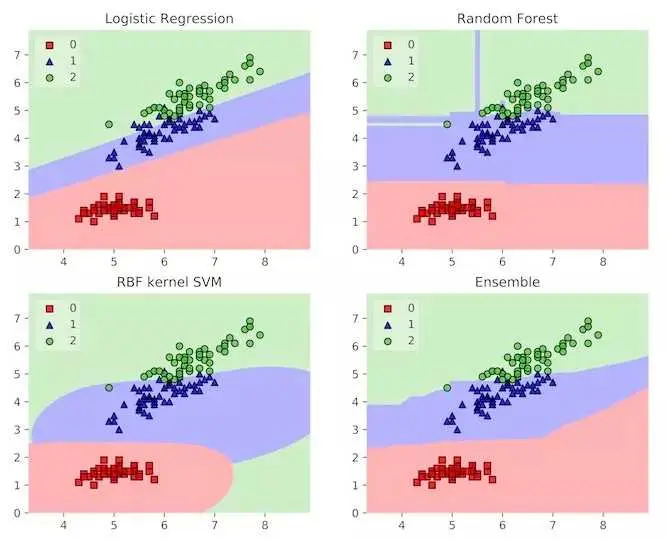 如果集成包含两个以上决策树,则它根据多数原则进行预测。因此,集成对分类器预测结果取平均又叫作多数投票分类器(majority voting classifier)。当集成基于概率取平均时,我们称其为软投票,而对类别标签预测结果取平均被成为硬投票。