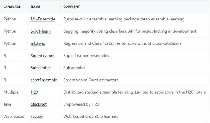 当我们谈到软件时,每个人都有自己的喜好。随着集成方法的流行,集成工具包的数量也越来越多。实际上集成方法是先在统计学社区中流行起来的,所以 R 语言中有很多为此设计的库。近年来,Python 和其他语言中也出现了更多相关工具。每个工具包都能满足不同的需求,处于不同的成熟阶段,所以我建议大家选用前先浏览一番再做决策。