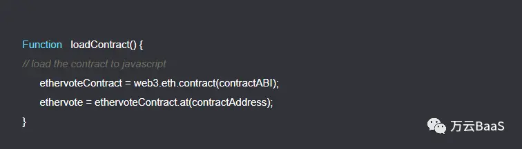第一行建立了合约名称,同时第二行创建了一个命名为“LogVote”的事件,它将会在日志文件中记录以下内容: