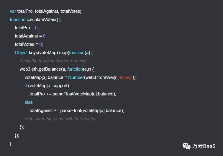 最后,直到加到最终的总数为止。我们之前已经在同步模式下使用了eth.getBalance,在此模式下,应用会等待前一个操作的结果再继续。此处,因为我们可以对于每一个区块调用大量操作,我们将会在异步模式下运行它:你可以异步调用getBalance函数,等到节点返回后,再进行票数统计。
